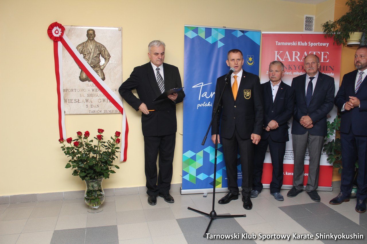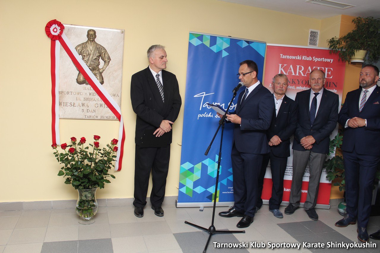 W dniu 23 czerwca 2018r. na hali sportowo – widowiskowej Tarnowskiego Ośrodka Sportu i Rekreacji odbyło się uroczyste odsłonięcie tablicy zmarłego shihana Wiesława Gwizd 5 dan. Wydarzenie to było zapoczątkowane nadaniem hali imienia shihana Wiesława Gwizd podczas jednej z sesji Rady Miasta Tarnowa. Uroczystego odsłonięcia dokonali przedstawiciele Urzędu Miasta oraz RADY Miasta Tarnowa, TOSiRu i Polskiego Związku Karate razem z rodziną Ś.P. shihana Gwizda. Po odsłonięciu odbył się krótki pokaz karate z udziałem tarnowskich dzieci, pokaz kata (Tsuki No Kata) karateków z Tarnowa i wielkie show sensei Andrzeja Kuleszy z Łosic (testy tamashiwari). Dziękujemy za obecność, a nieobecnym przedstawiamy krótką fotorelację z uroczystości.